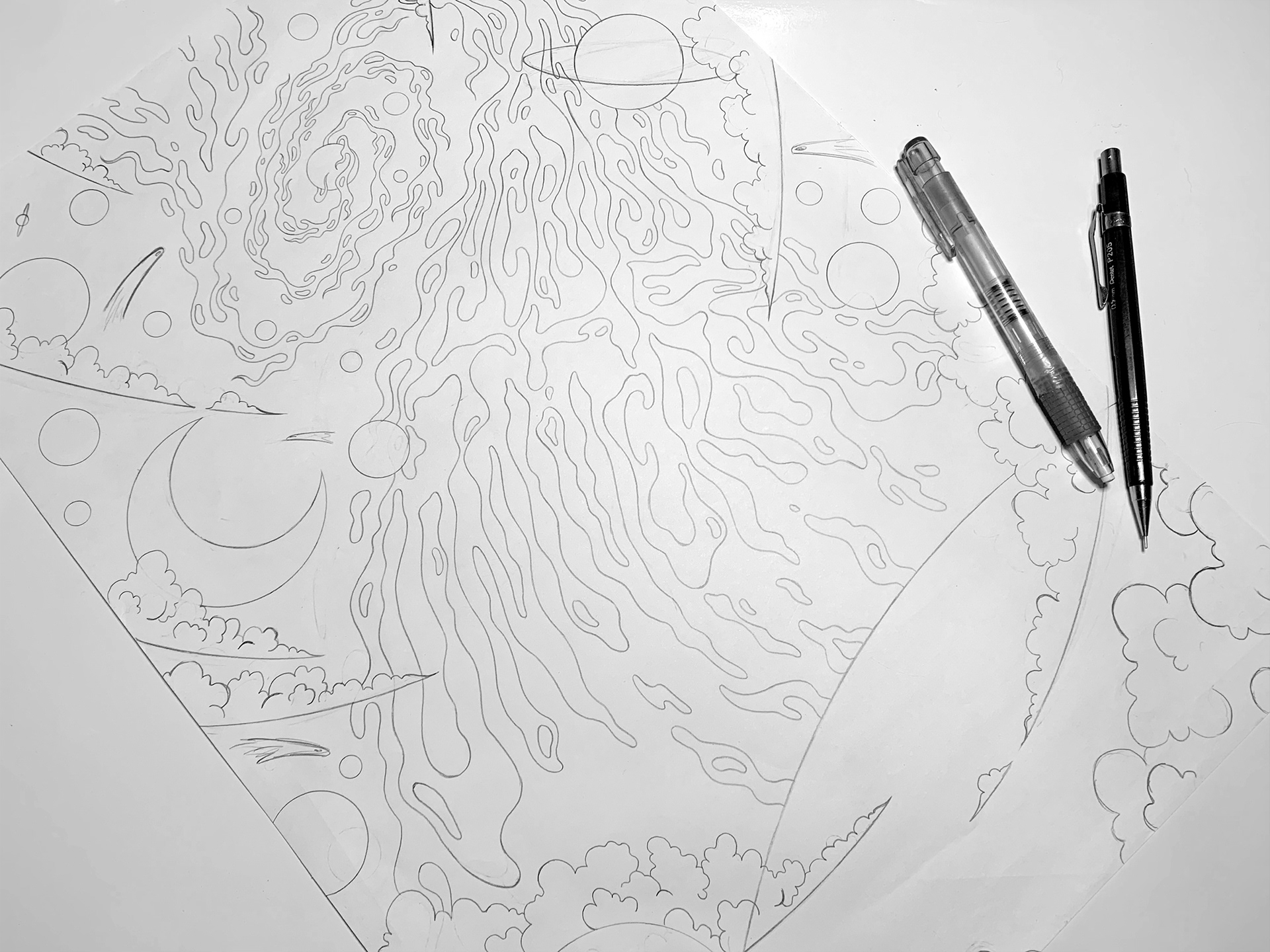 This artwork capture all my feelings when I listen to this song. Through the representation of space with celestial bodies, the song's title in the space dust and bright colours, I tried to represent a self-knowledge journey through the universe, a remote and unknown place where all thoughts seem to flow, to transcend and uplift the mind and spirit as if you are in a meditative state. Exactly the same feelings that drawing represents to me.