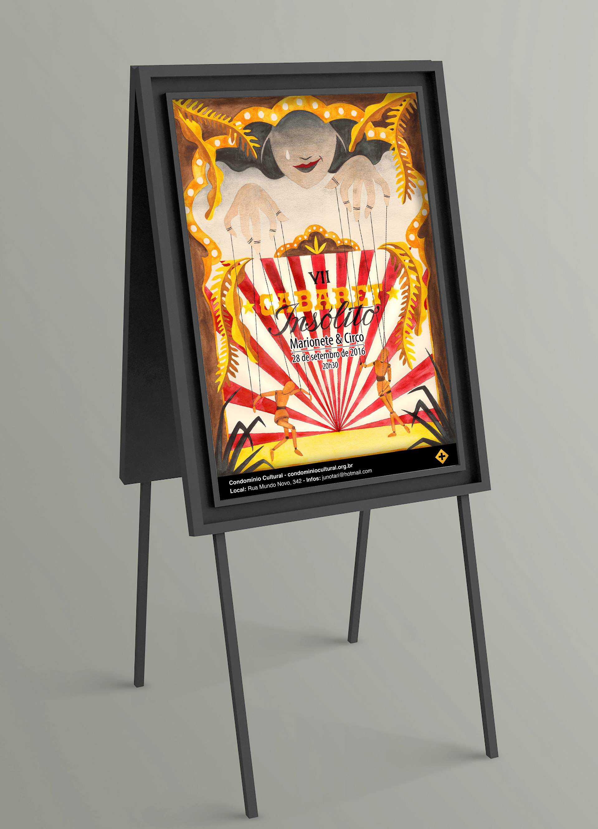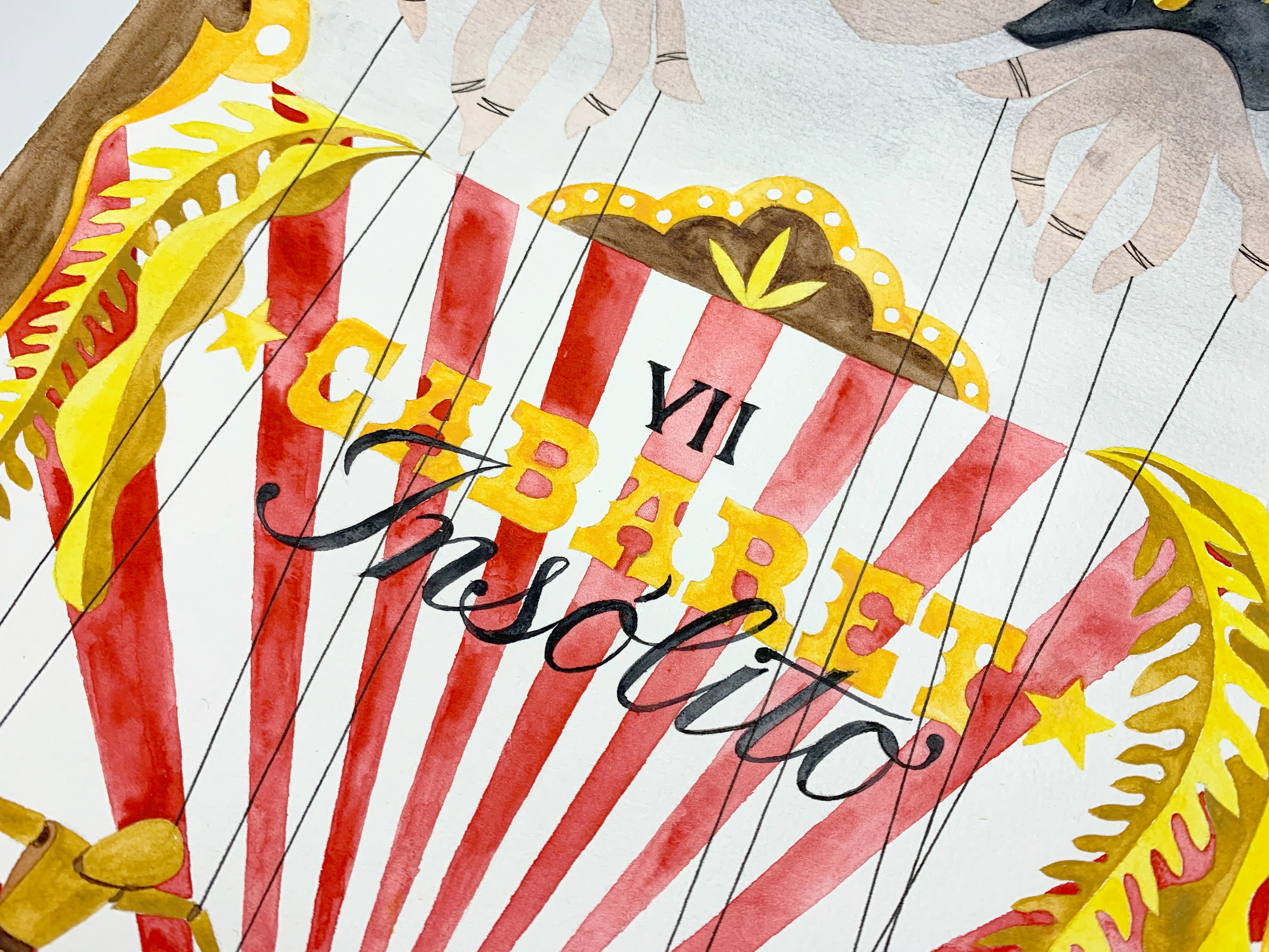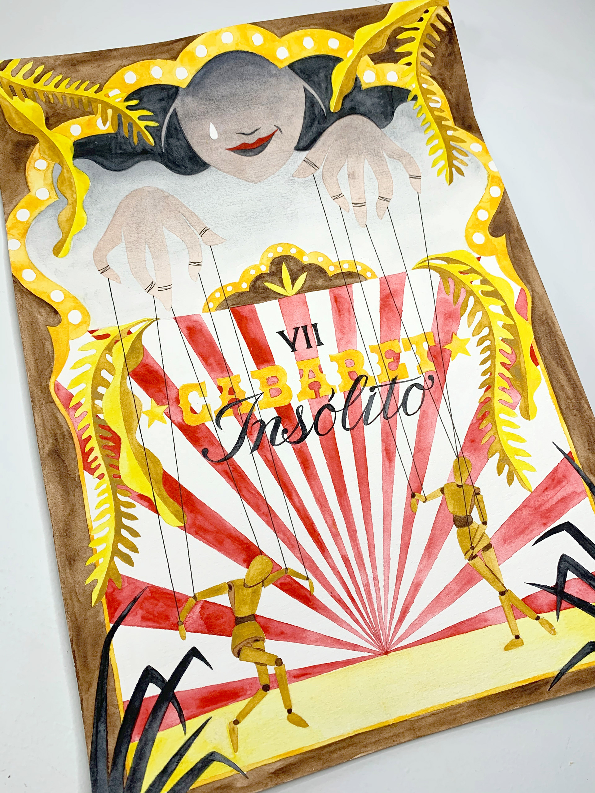 Watercolor poster created for Cabaret Insólito (seventh edition), an event that mixes artistic performances with circus and puppet created and organized by Juliana Notari at the Condomínio Cultural in 2016.